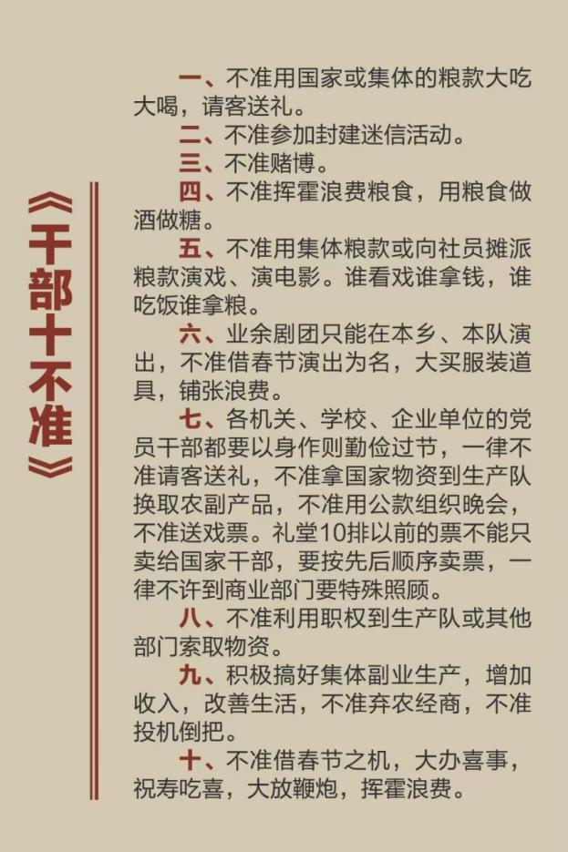 姥爺連夜起草了一份《干部十不準(zhǔn)》:“不準(zhǔn)任何干部特殊化,不準(zhǔn)任何干部和他們的子弟“看白戲”……”以此作為警示。