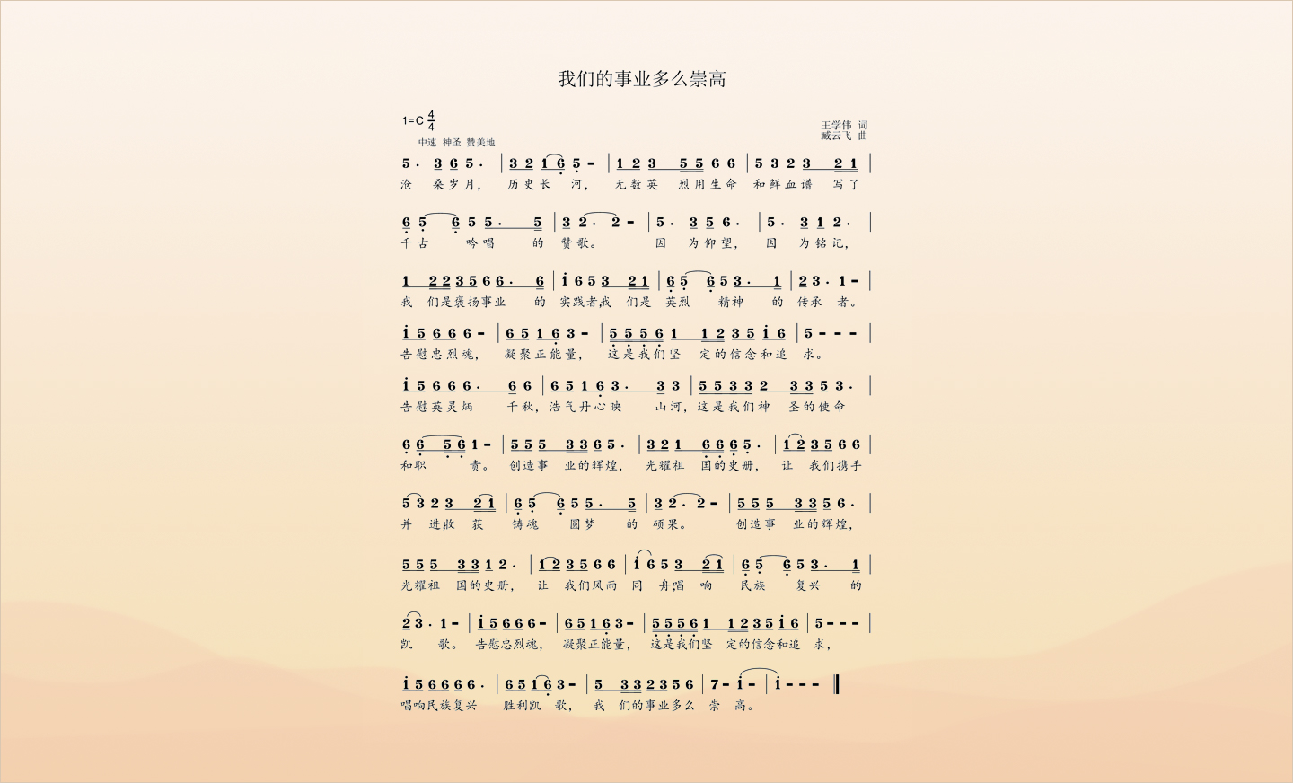 會歌旨在以永不消逝的旋律歌頌和銘記英烈事跡,傳承和弘揚英烈精神。從歌詞到樂譜體現(xiàn)中華英烈不怕犧牲、不為艱險的英雄氣概,深情謳歌中華英烈用赤膽忠心鑄就勝利榮光、捍衛(wèi)祖國尊嚴的偉大壯舉。歌詞簡約大氣,力求抒發(fā)中華英烈褒揚事業(yè)的神圣和崇高。樂曲旋律深情飽滿、昂揚豪邁,力求每一個音符都撞擊聽眾靈魂,切身感受中華英烈感動天地、氣壯山河的高貴品格,呼喚和感召世人傳承英烈志、凝聚民族魂、共圓中國夢。
